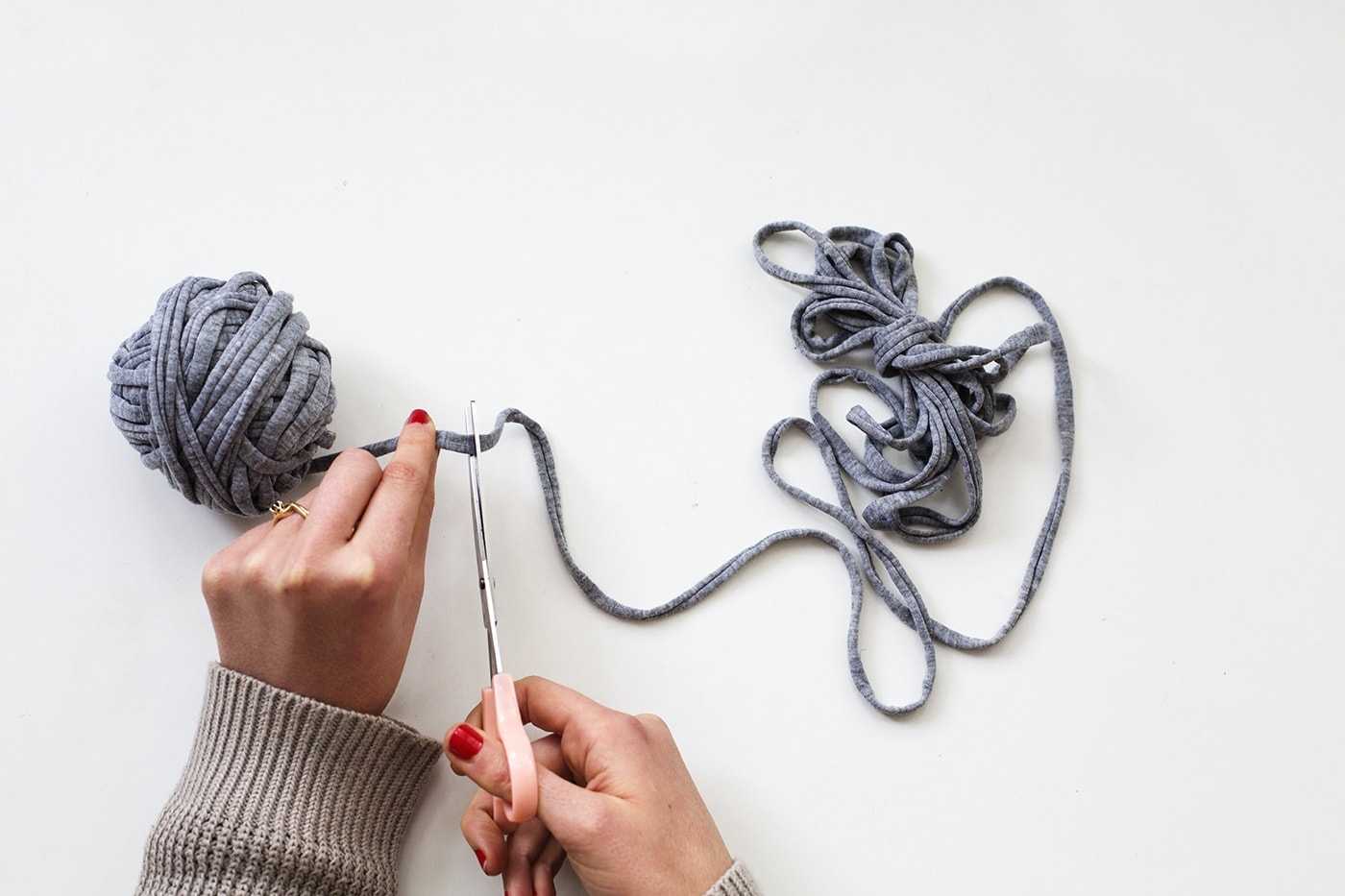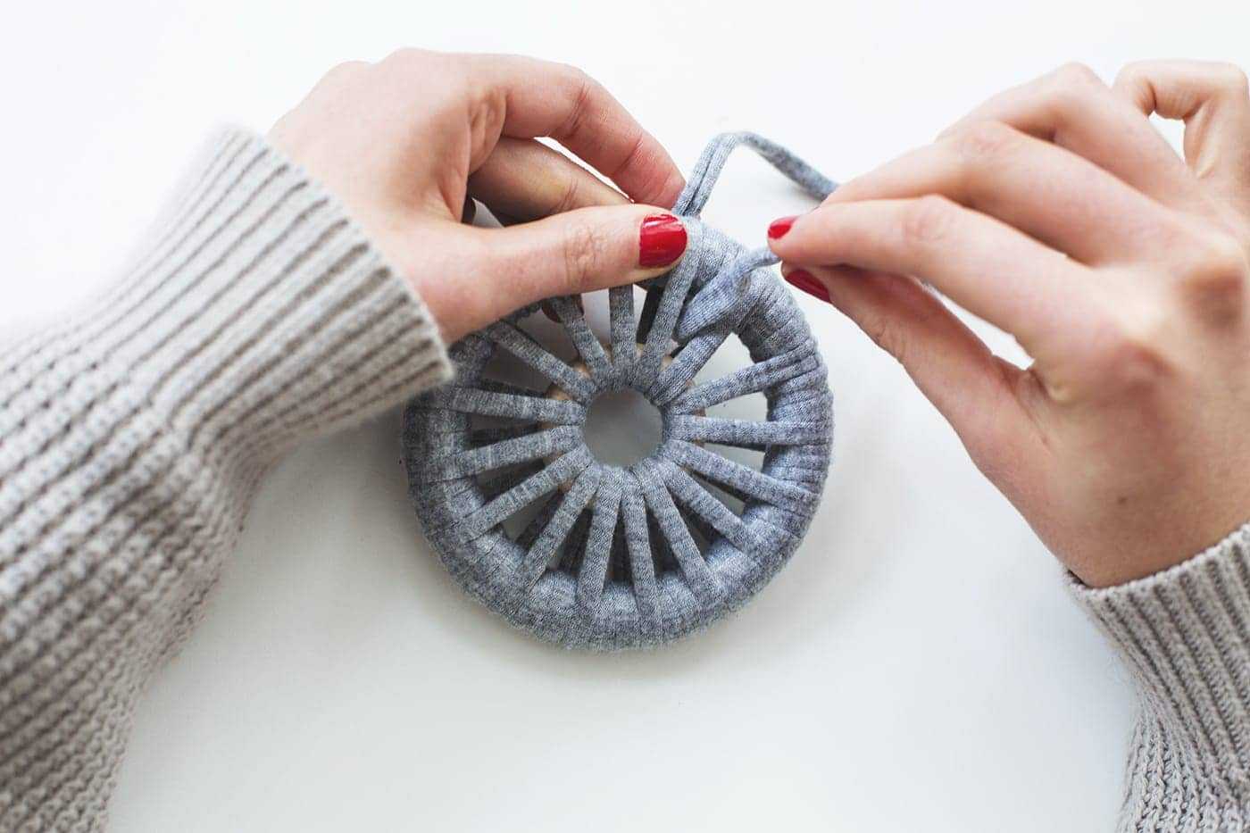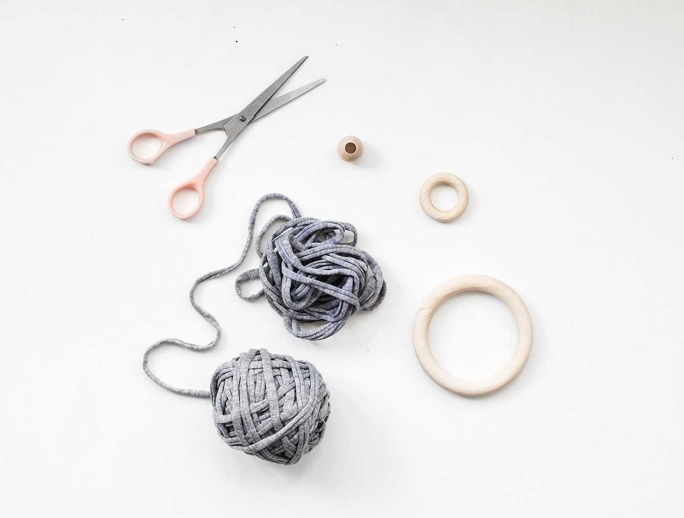 К большому деревянному кольцу с помощью двойного узла привязываем конец трикотажной веревки. Короткий хвостик, выходящий из него, обрезать не нужно.
