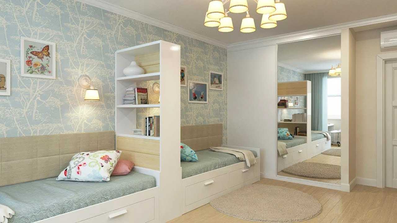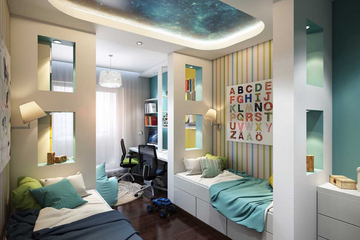 - в разных концах помещения — такой вариант больше подойдет для комнаты мальчика и девочки, особенно при значительной разнице в возрасте детей;