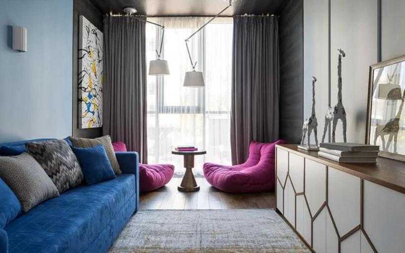 Не расставляйте всю мебель около вытянутых стен и отдайте предпочтение легким, пропускающим свет конструкциям. Удачным решением могут стать небольшая кушетка, стоящая в узком месте, или несколько кресел и пуфов разной формы и цвета.