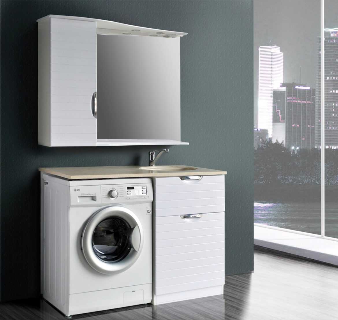 Альтернативой высоким пеналам служат тумбы. В крышку самых компактных из них можно вмонтировать умывальник, а снизу под ним расположить стиральную машинку. Также в продаже встречаются модели со столешницей, в которую врезают раковину. Высота такой мебели составляет всего 90-95 см, в зависимости от размеров встраиваемой техники.