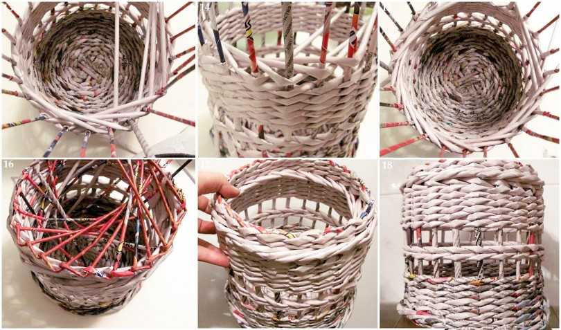 - После того как дно сплетено, концы поднимите вверх и начните плести стенки. Как будет достигнута нужная высота стенки, бумажные прутки нужно будет загнуть для приобретения эстетичного вида изделия.