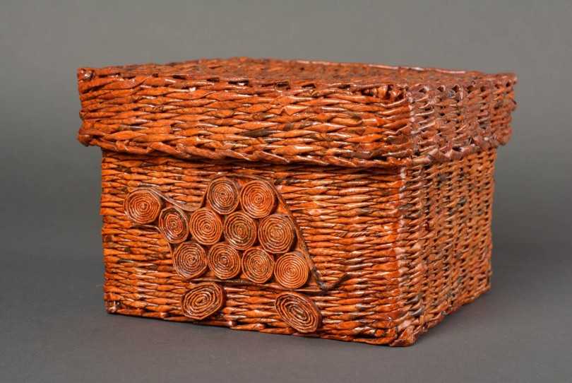 Шкатулку с крышкой можно сделать по аналогии выше представленной инструкции. Сначала необходимо сплести основу – емкость нужной формы, а уже после перейти к изготовлению крышки. В зависимости от формы поделки определяют, как будут делать крышку. Если это квадратная шкатулка, верх можно сплести по аналогии с дном – воспользоваться картоном в качестве основы.