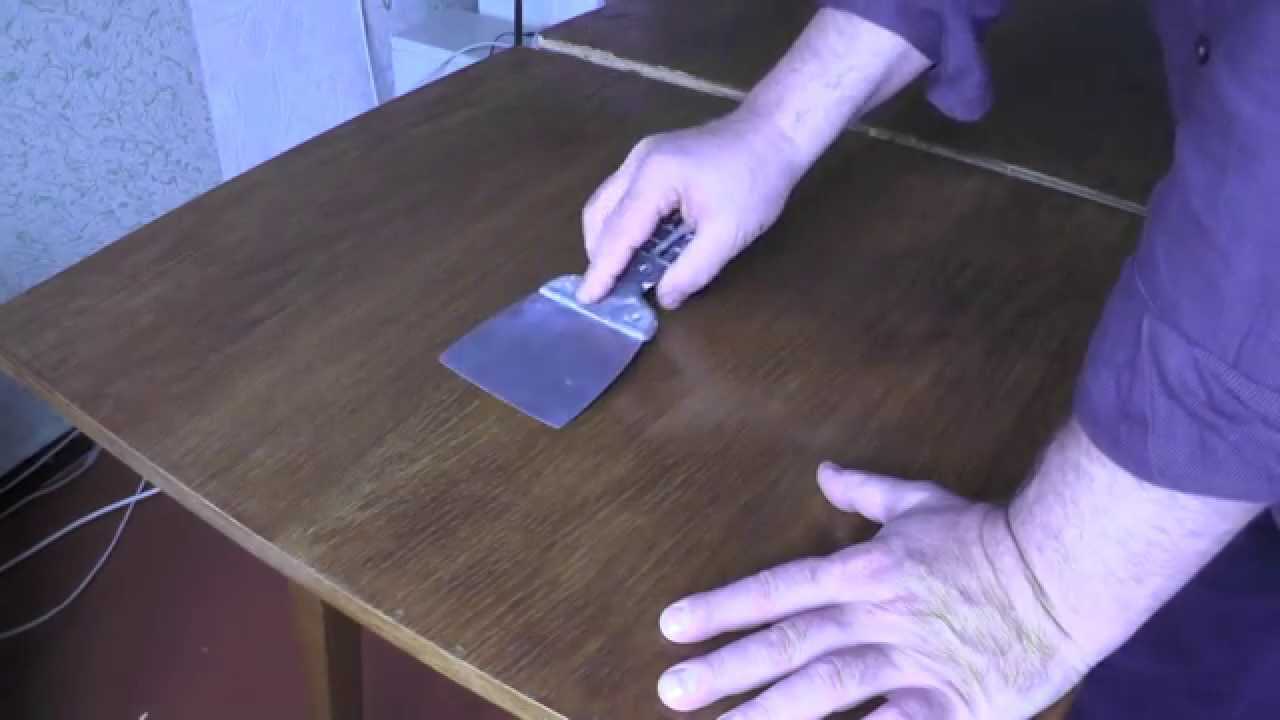 После соскребаете покрытие по направлению древесных волокон при помощи шпателя