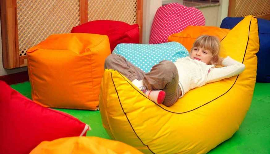 Бескаркасный пуф в комнате ребёнка может быть не только ярким акцентом. Такое кресло является удобным местом для отдыха в полезной для здоровья позе, способствующей укреплению глубоких мышц спины.
