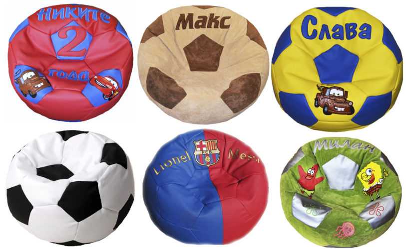 - Мяч – наиболее востребован молодыми мужчинами, поклонниками спорта. Такую же форму может иметь детское кресло-мешок для мальчика, которое просто сделать своими руками из сшитых между собой черно-белых пятиугольников. Если выбрать в качестве внешнего чехла кожзаменитель, то мягкий пуфик будет выглядеть, как большой футбольный атрибут. Любители баскетбола сооружают сиденье из двух полукруглых оранжевых сфер с темной полосой. Более того, фанаты могут украсить свой аксессуар наклейками или вышивкой с названием команды.