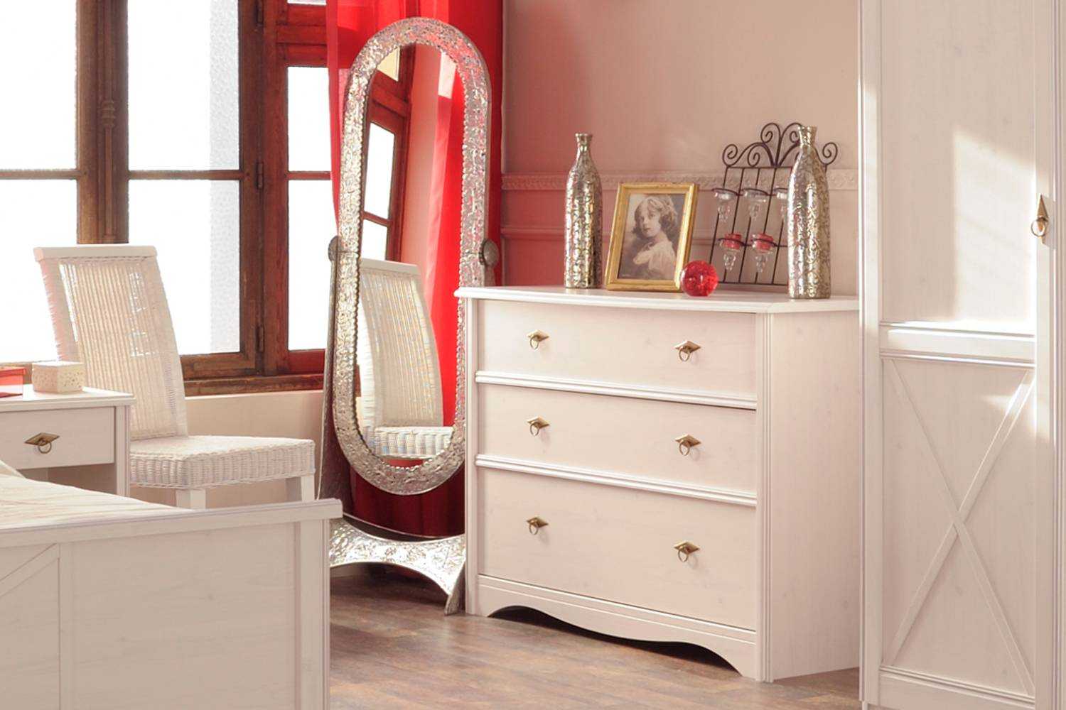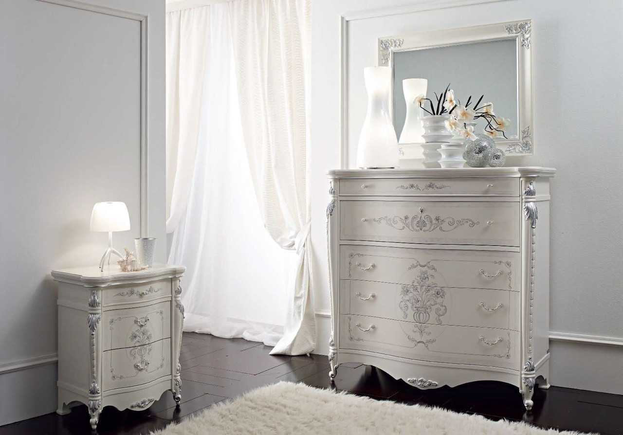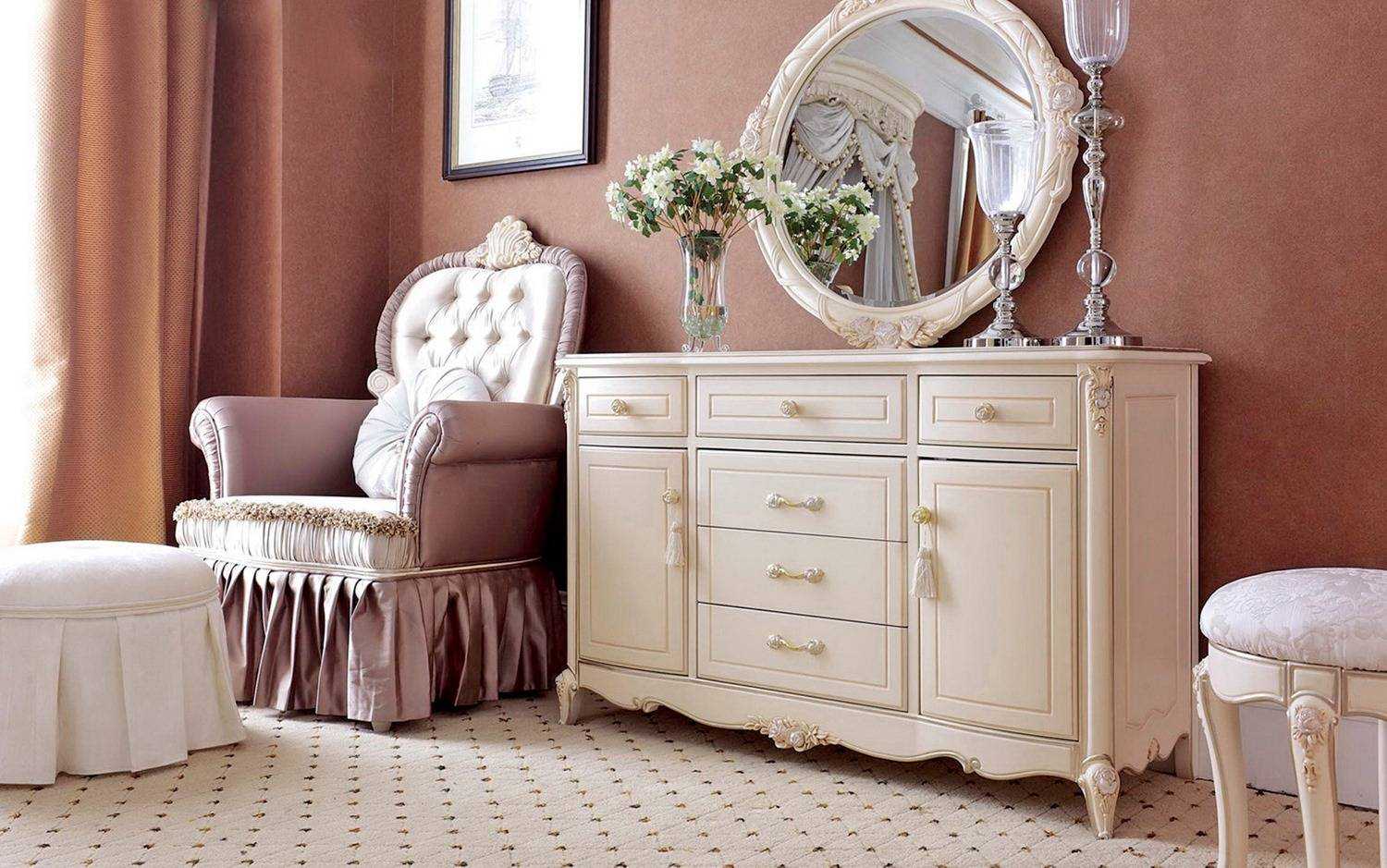 Этот стиль будет уместен в помещении любого размера. Распространенной моделью в спальне с таким дизайном считается комод с зеркалом. Здесь он исполняет роль столика и предмета хранения.