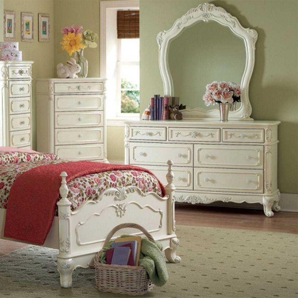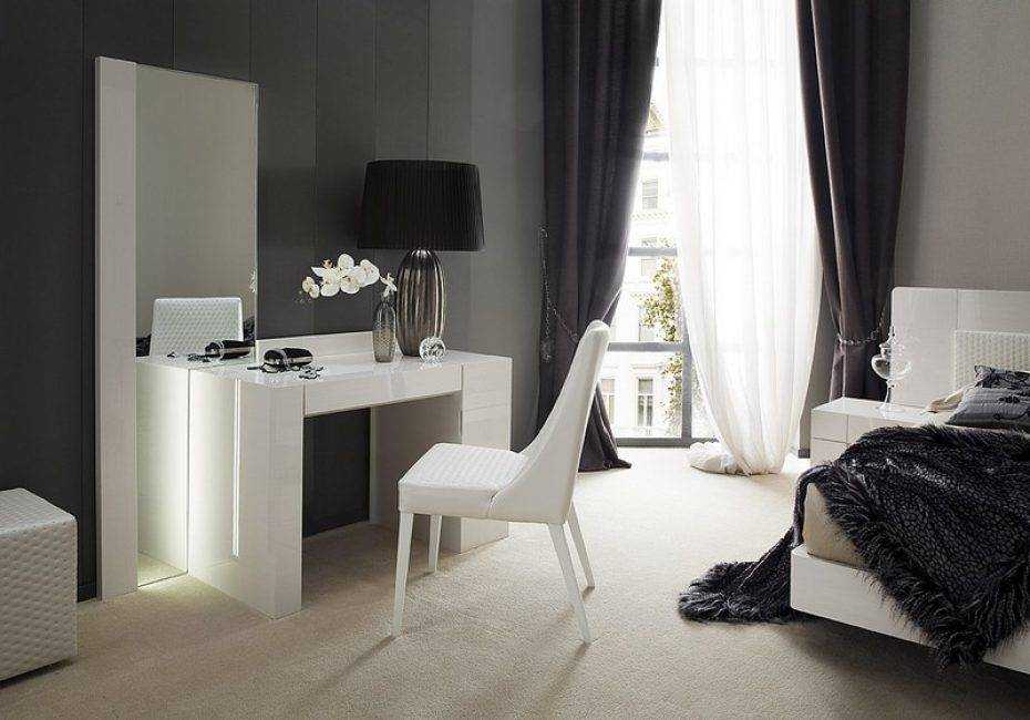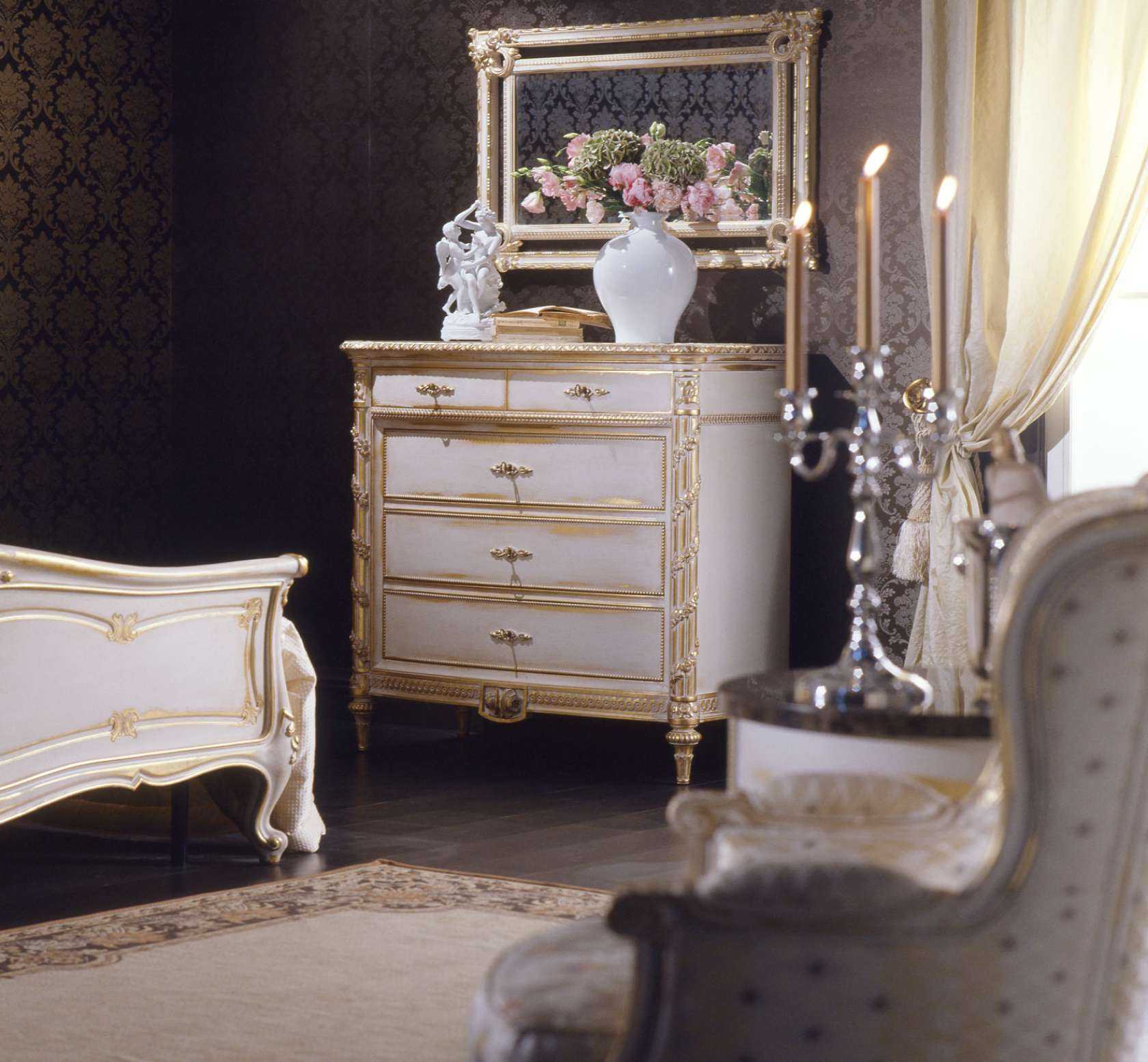 Этот стиль будет уместен в помещении любого размера. Распространенной моделью в спальне с таким дизайном считается комод с зеркалом. Здесь он исполняет роль столика и предмета хранения.