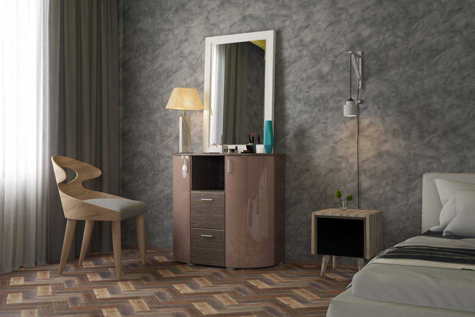 - Туалетный столик. В женской спальне это – необходимая часть интерьера. При этом он должен быть простым, сделанным из металла или дерева. Заменить его можно обычным зеркалом, окруженным несколькими полочками.