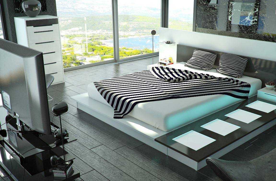 Основным элементом спальной комнаты является кровать, которая занимает центральное место. Желательно, чтобы она была широкой, даже если комната рассчитана на одного человека. Современная кровать обычно имеет низкие простые ножки. Часто ее располагают на сплошном основании или подиуме, которые нередко оснащают выдвижными ящиками для повышения функциональности.