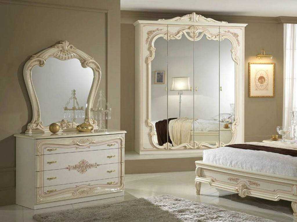 Иногда присутствует комод и туалетный столик. В зависимости от площади комнаты существуют модели разных габаритов. Большинство покупателей выбирают шкафы-купе, они вместительны и обычно оснащаются зеркалами, это визуально увеличивает помещение и освобождает от необходимости размещения отдельного полотна.