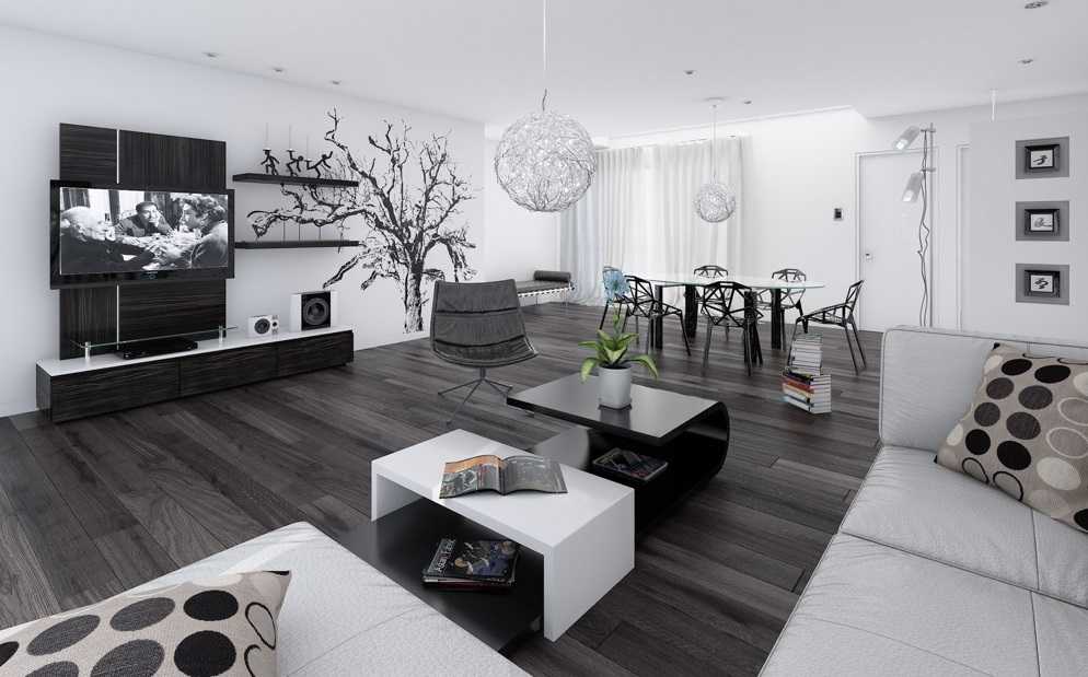 - Наиболее универсальные – нейтральные однотонные цвета (белый, черный, серый, коричневый и их оттенки). Например, черный диван, серое кресло.