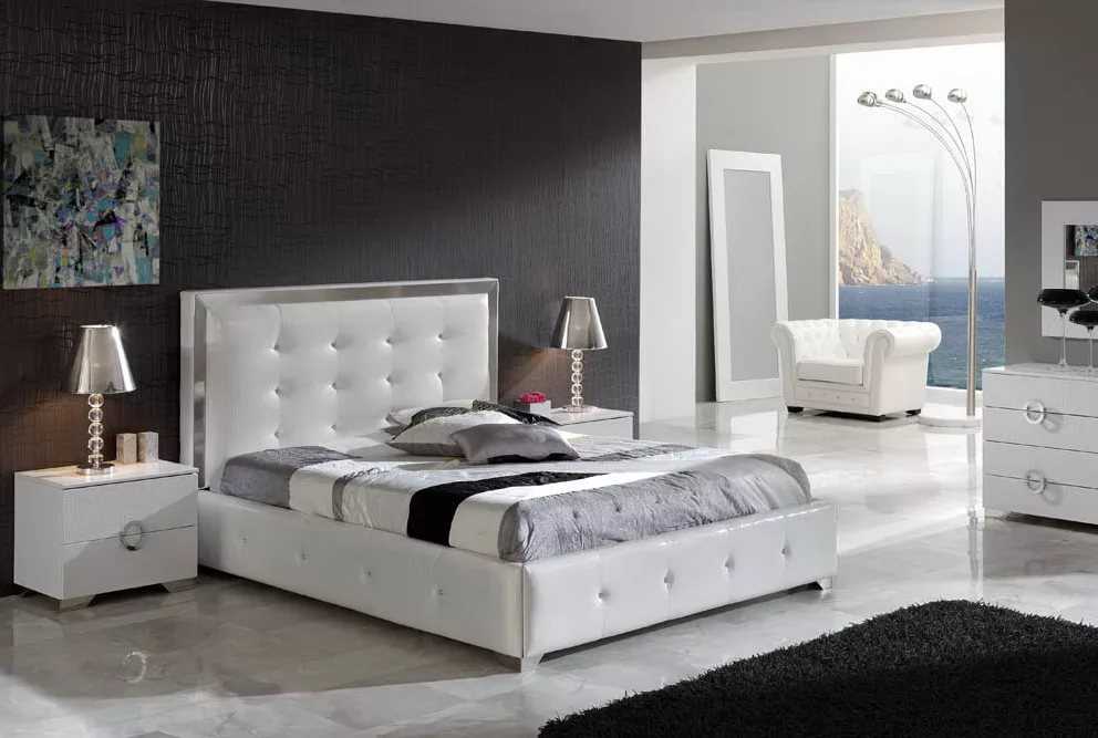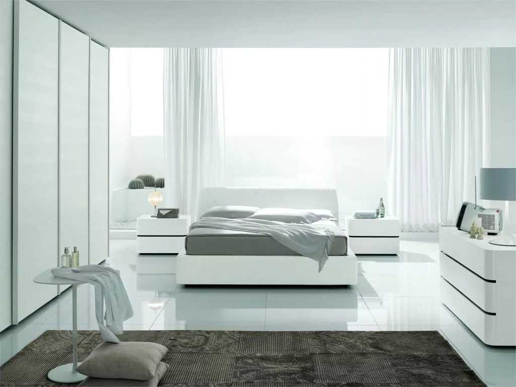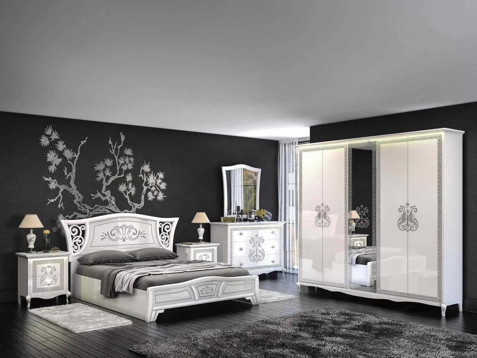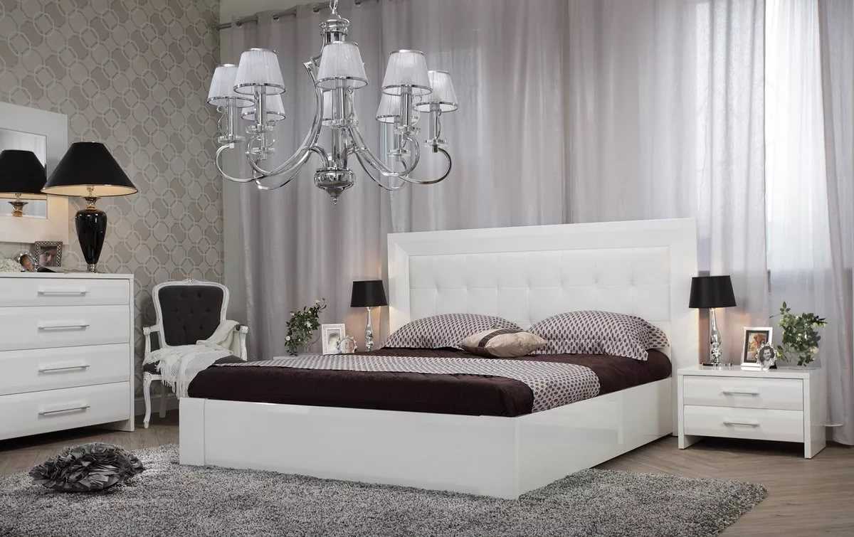 - хай-тек — комплект белой глянцевой мебели для спальни отлично сочетается с покрытиями серебряного или черного цвета;