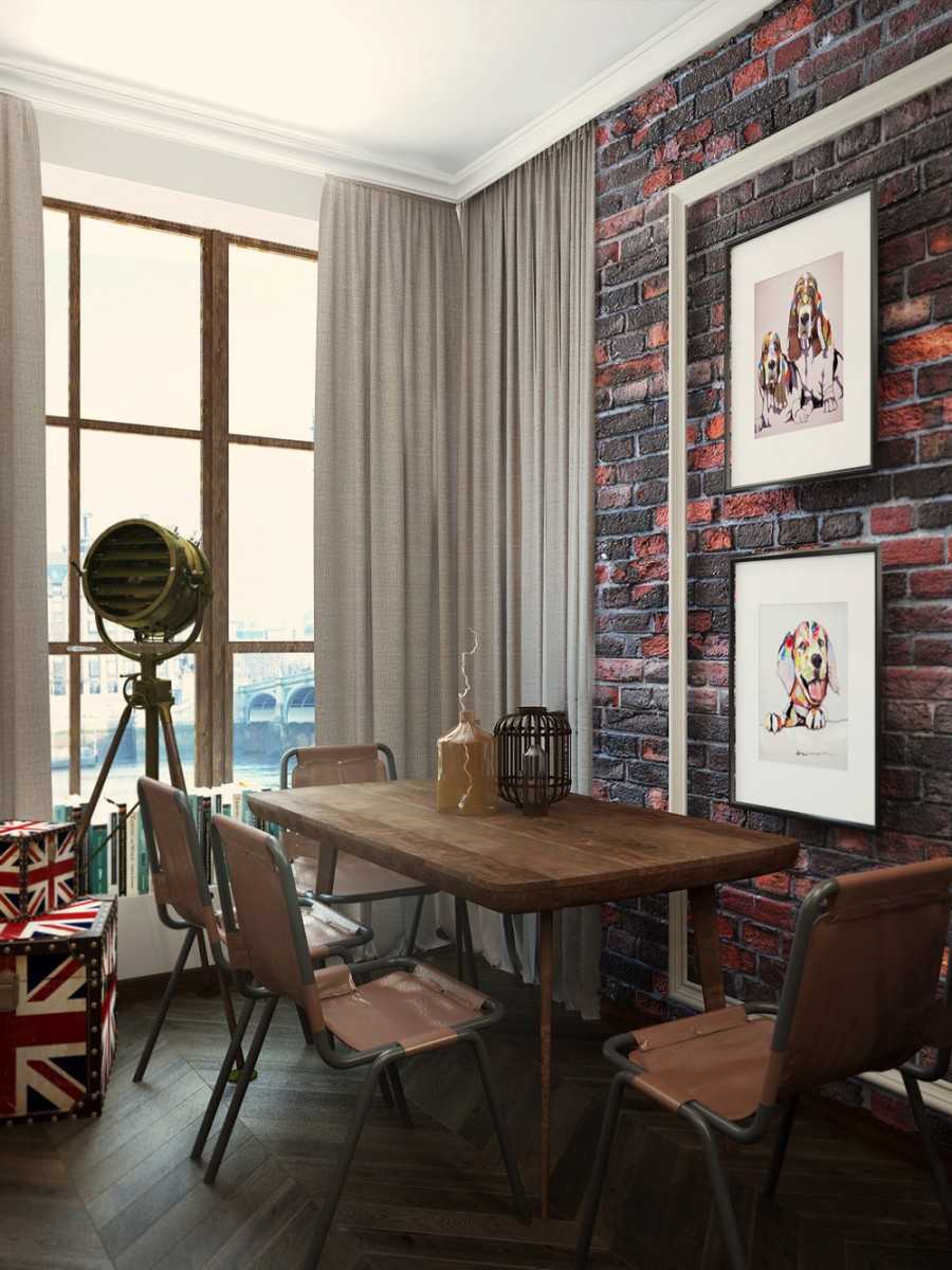 - стены окрашивают в один неброский цвет либо имитируют кирпичную кладку, для пола используют паркет или ламинат с максимально однотонной текстурой, могут использоваться бетонные или наливные полы. Для зонирования пространства можно использовать металлические перегородки со вставками из металла или пластика;