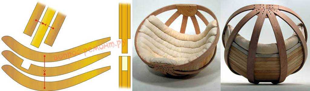 Во-вторых, фанера дает возможности применять нестандартные технические решения, напр. как справа на рис. Такую качалку-чашу из фанеры можно сделать, пользуясь опять-таки только электролобзиком. Удобство – высокое, устойчивость абсолютная, и может служить подвесным креслом-гамаком или креслом-качелями. Толщина досок-ламелей от 12 мм; соединительных полушайб на полюсах – от 24 мм.