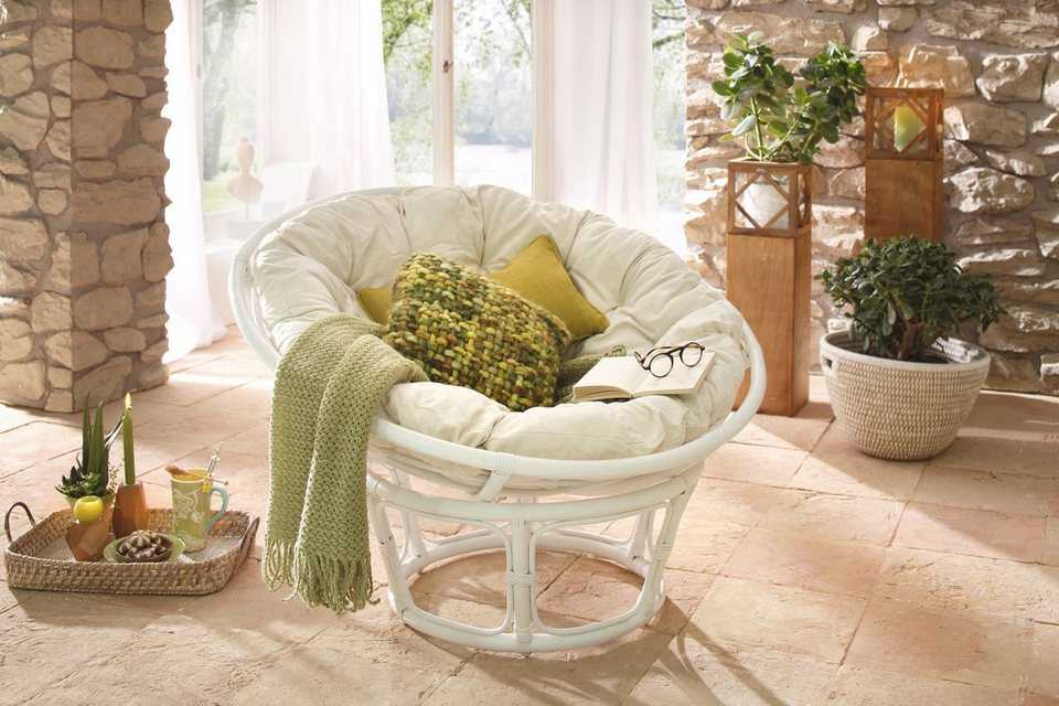 - Вращающееся плетенное ротанговое кресло Papasan. Этот вид мебели идеально подойдет для тех людей, которые не очень любят стандартные модели. Устойчивая конструкция обеспечивает безопасность, комфорт и устойчивость, а также полное отсутствие любых звуков при вращении.