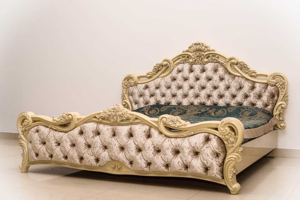 - Ампир. Идеальной будет кровать кремового или бежевого цвета со спинкой в позолоченной раме, с элементами ковки.