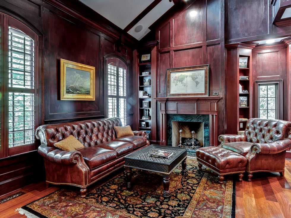 Гостиная в английском стиле отделана деревянными панелями буазери
