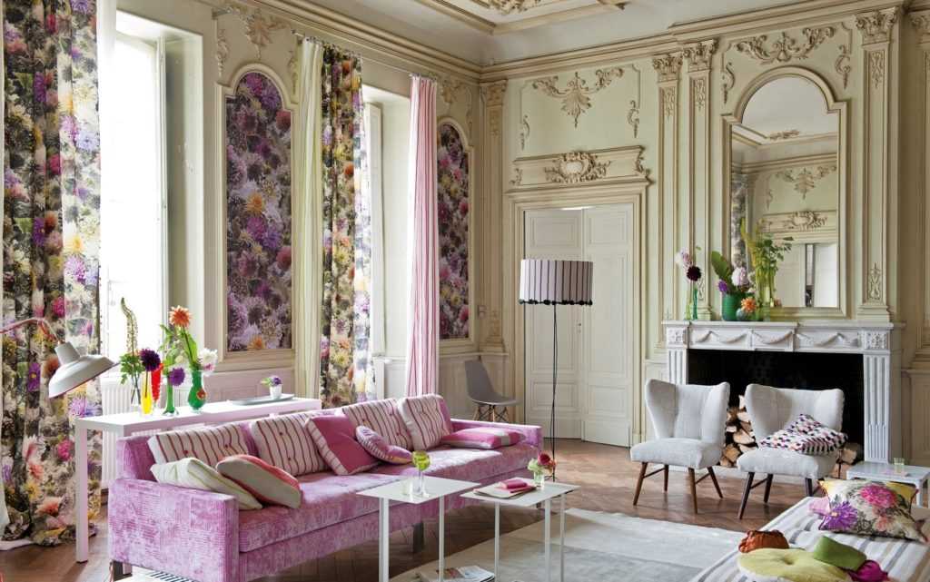 - цветочный принт — крупные или мелкие соцветия повторяются в других элементах интерьера;
