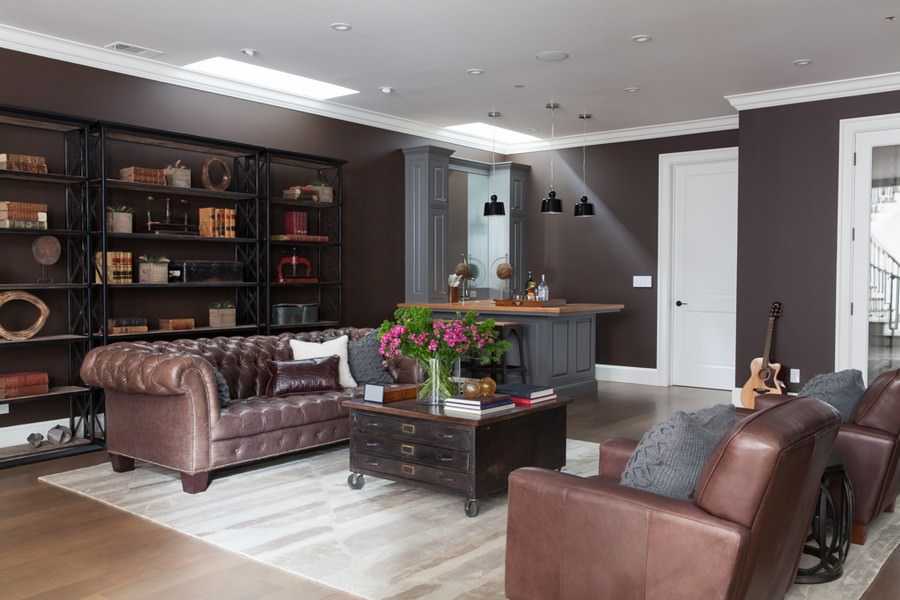 Кабинет может быть совмещён с библиотекой. В нем обязательно должен быть организован уголок для неспешной беседы с партнером или друзьями, или для распития вечернего аперитива.