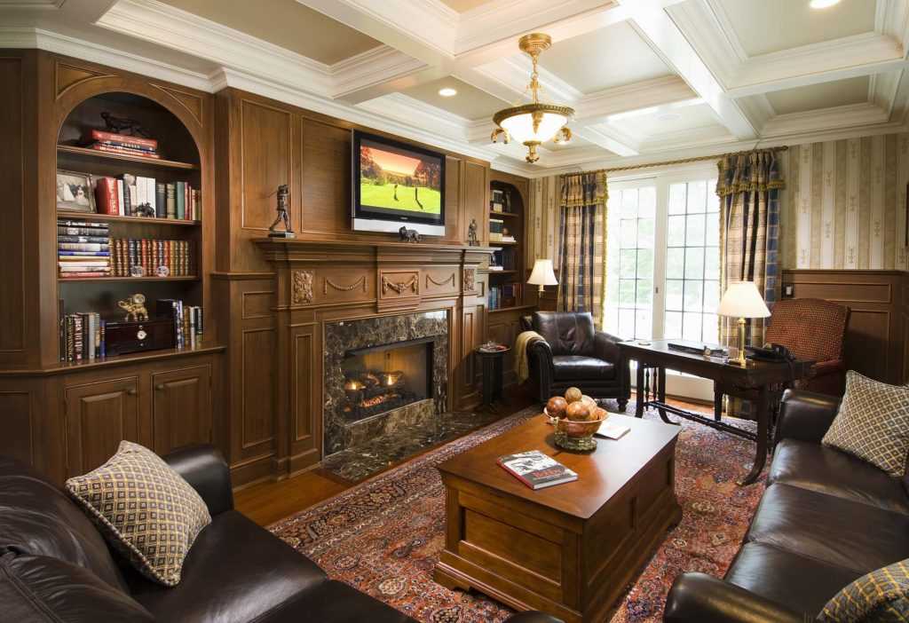 В гостиной, совмещенной с библиотекой или кабинетом, стены обшиваются деревянными панелями. В такой отделке существуют различные варианты: панели могут выполняться от пола до потолка. Или скрывать стены только до половины, или располагаться с промежутками. Оставшаяся часть оклеивается обоями или покрывается текстилем.