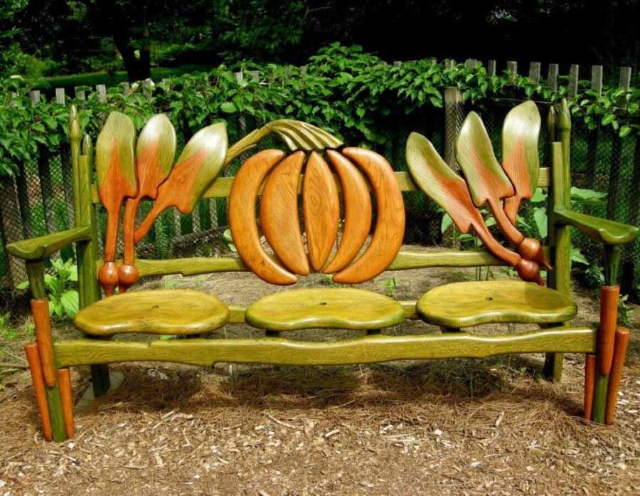 Эта категория мебели дает огромный простор для воображения. Даже готовые модели совершенно разные: с двумя клумбами по бокам, с одной сзади, с мини-цветниками на подлокотниках. Что касается материалов, то больше всего для реализации такой задумки подходят деревянные изделия.