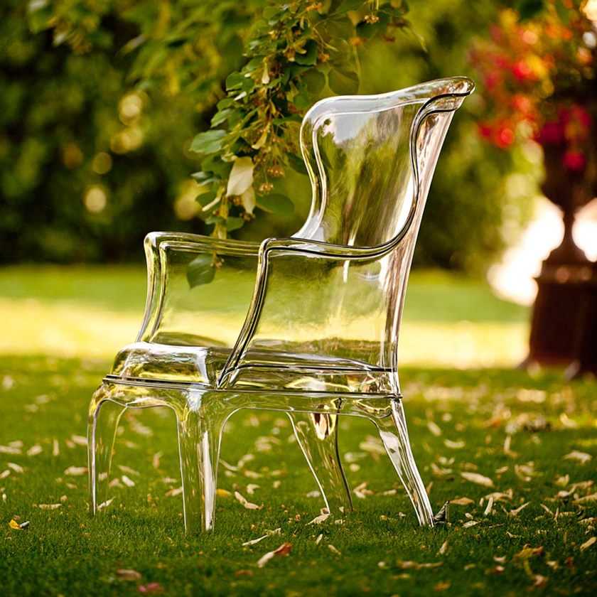 Прозрачный стул из поликарбоната отлично смотрится не только в интерьере помещения, но и на открытой веранде, освещенной солнцем. Из этого материала производятся не только стулья, но и довольно внушительные кресла, способные принять вес до 200 килограммов.