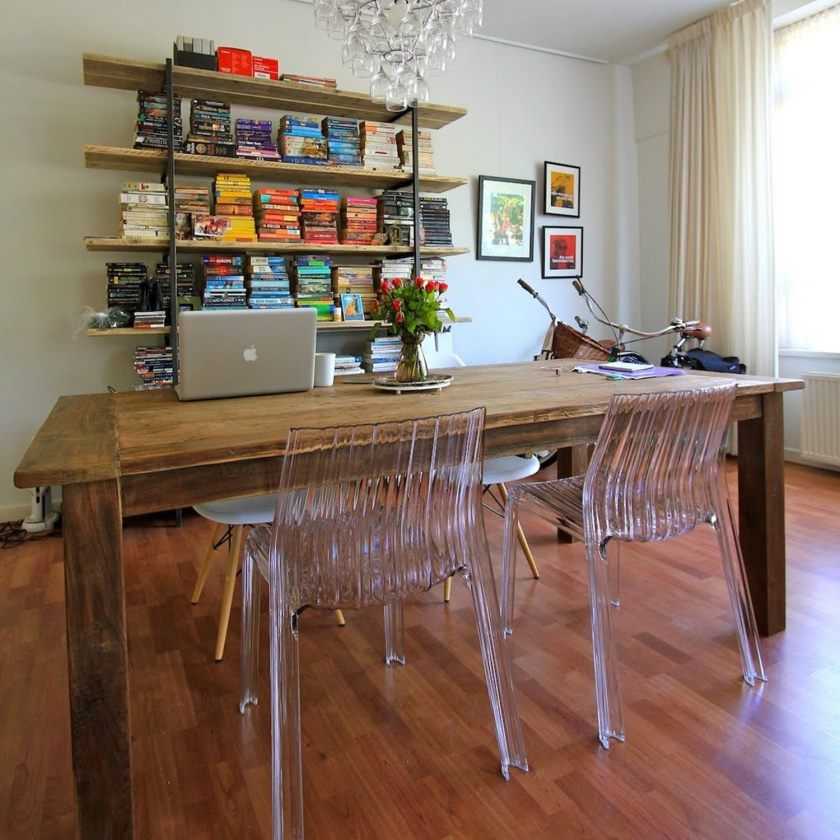 В гостиной такие стулья составят комплект с обеденным столом. Последний может быть выполнен из дерева, стекла, пластика.