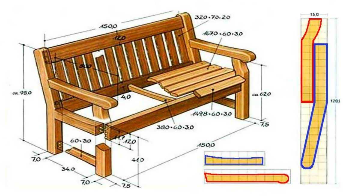 - Далее выполняется чертеж с точными размерами, перед этим необходимо выполнить замеры участка, куда планируется поставить скамеечку.