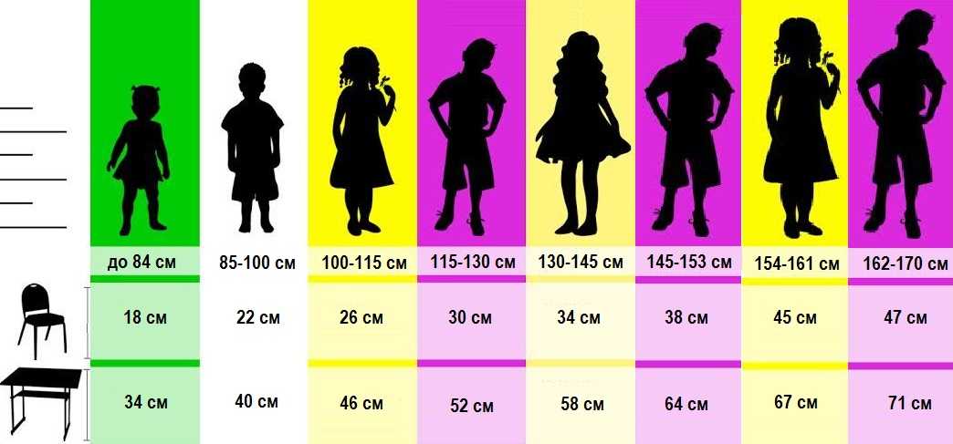 Соотношение по высоте стула и стола для ребенка разного возраста варьируется. При выборе следует руководствоваться показателям ГОСТа. Официальные стандарты по росту не меняются уже много лет: