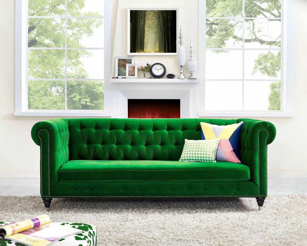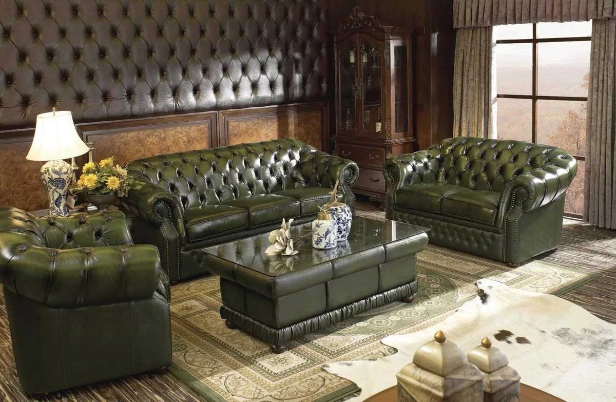 - Модель в викторианском стиле — это бархатный диван (возможен кожаный вариант) цвета травы или оливок. Форма отличается закругленностью, опорные элементы украшены резьбой, изящный декор присутствует на подлокотниках и спинке.