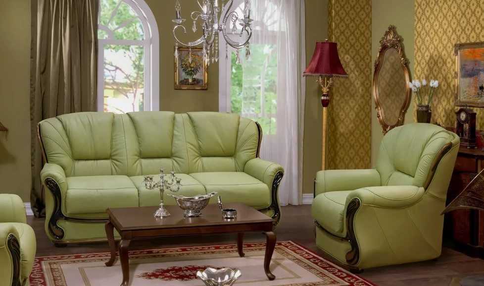 - Классический диван характеризуется плавностью форм, отделкой с позолотой, корпус выполняется из натурального массива дерева. Обивку выбирают тусклых зеленых тонов.