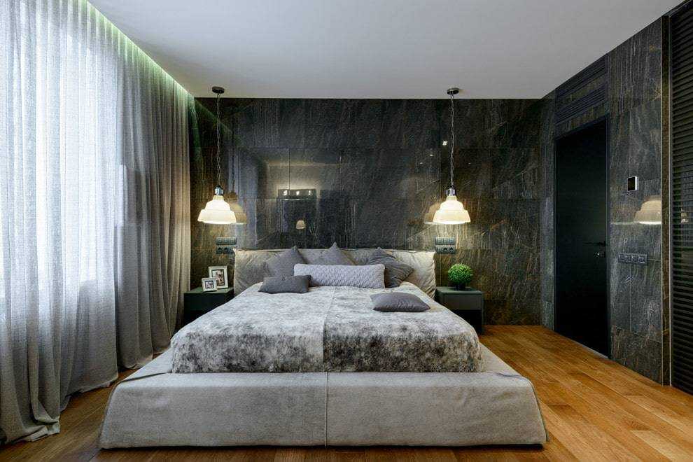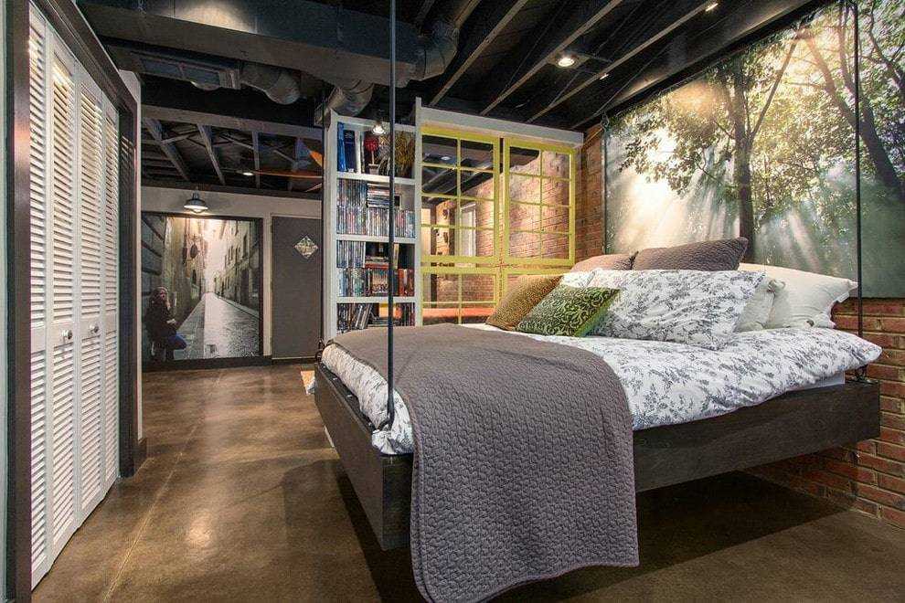 Здесь будут уместны удобные подвесные изделия с немного грубым дизайном, изготовленные из металла, матрасы на невысоких платформах, облицованных деревом или оббитых тканью, украшенной с помощью металлических элементов или разных заклепок. Главное чтобы оформление двуспальной кровати было максимально индустриальным.