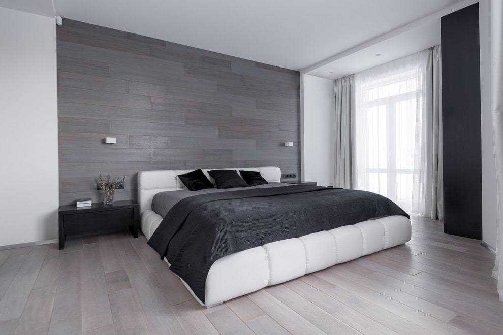 На фото двуспальная прямоугольная кровать, декорированная мягкой обшивкой черного цвета в интерьере спальни.
