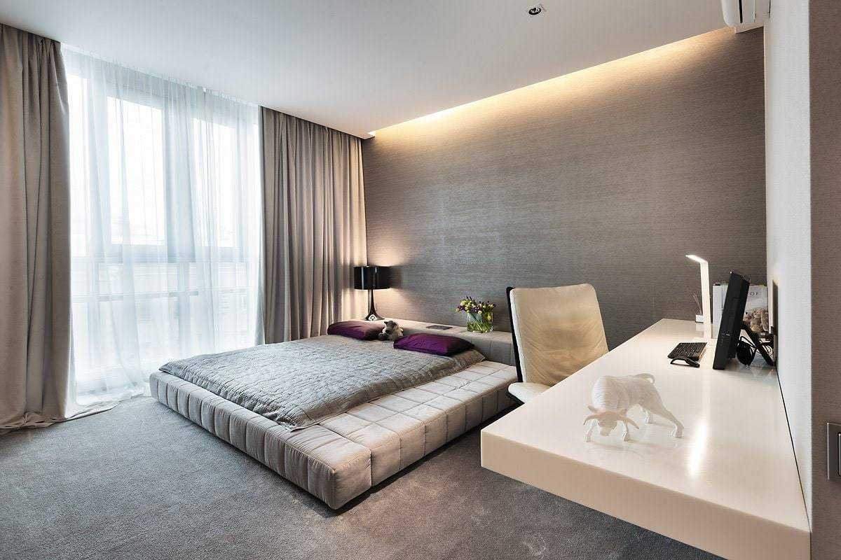 - Белый цвет спального ложа, особенно имеющего вид платформы, превосходно вписывается в светлую спальню в стиле минимализма. Стены в этом помещении чаще всего белые или серые. Сливаясь с ними, кровать делается еще более легкой. При светлом цвете полов, из-за отсутствия контраста, кровать не будет казаться слишком объемной, как показано на фото.