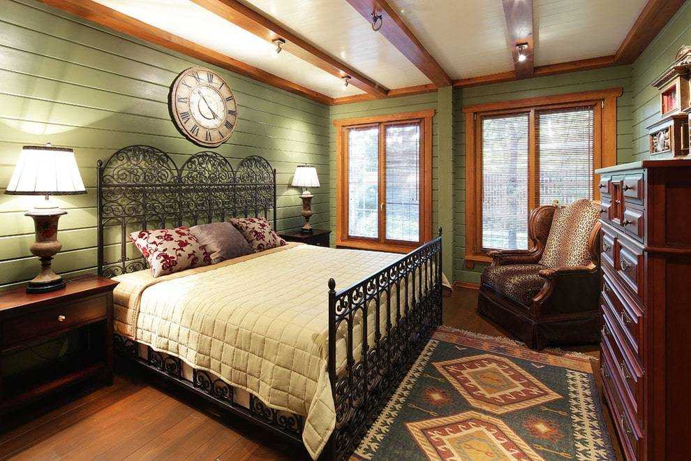 Большие и просторные двуспальные кровати с простым, добротным и основательным внешним видом в кантри-интерьере, могут быть выполнены из деревянного массива с нарочито грубой поверхностью или обладать металлическим кованым каркасом на ножках.