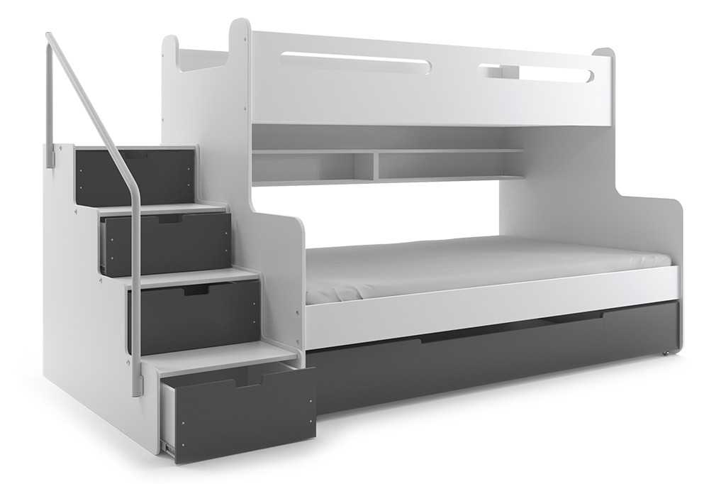 - Все три кровати разделены дополнительными элементами. Первый ярус содержит одну кровать, а второй ярус разделен на 2 кровати: слева располагается одно спальное место, под ним шкаф. С противоположной стороны организована зона для хранения. Габариты такого изделия составят 310х200х170 см.
