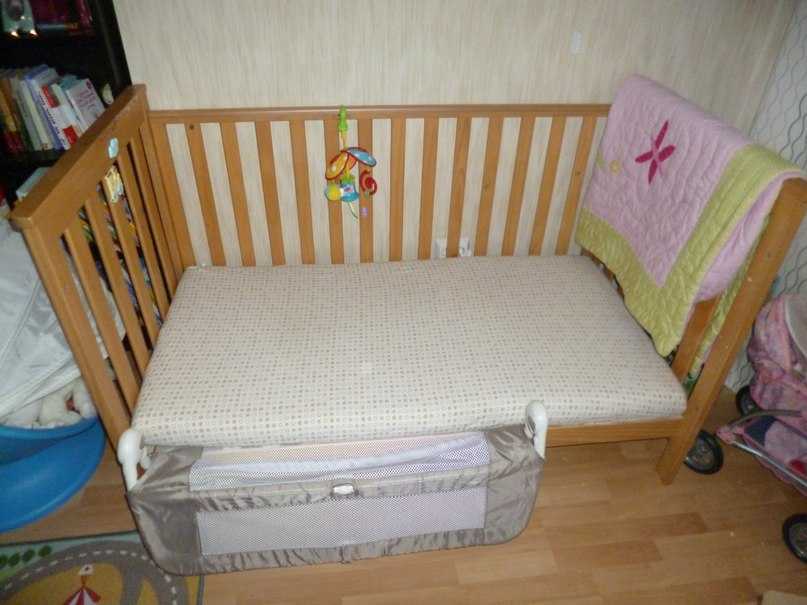 Приставная детская кровать. Данную модель легко «пристроить» к любому месту, где спят родители. Она малогабаритна (50*90 см), имеет высокие боковые стенки, одну из которых можно снять, регулируемое дно и крепкие фиксаторы для прочного соединения со взрослой мебелью для сна.