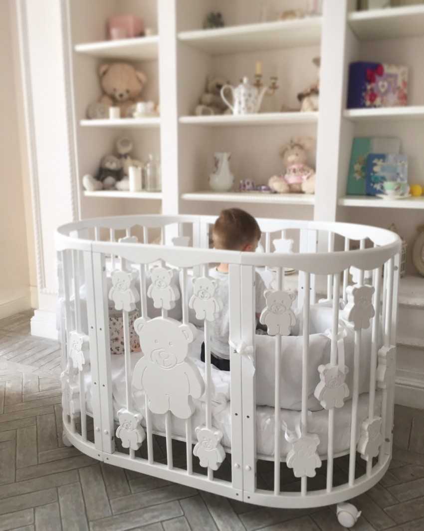 Диаметр круглых кроваток обычно не превышает 90 см, то есть они предназначены для детей с рождения и до 3-6 месяцев, после чего кроватку требуется сменить. Зачастую круглые кроватки являются трансформерами и при достижении ребенком определенного роста они легко удлиняются, превращаясь в овальные.