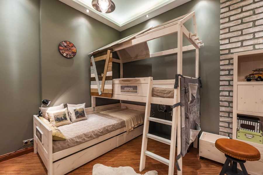 Вполне можно выбрать вариант оформления из дерева темного цвета или, например, тот ярус, на котором будет спать девочка, оформить в соответствии с ее предпочтениями, а при оформлении яруса, где будет спать мальчик, учесть его интересы.