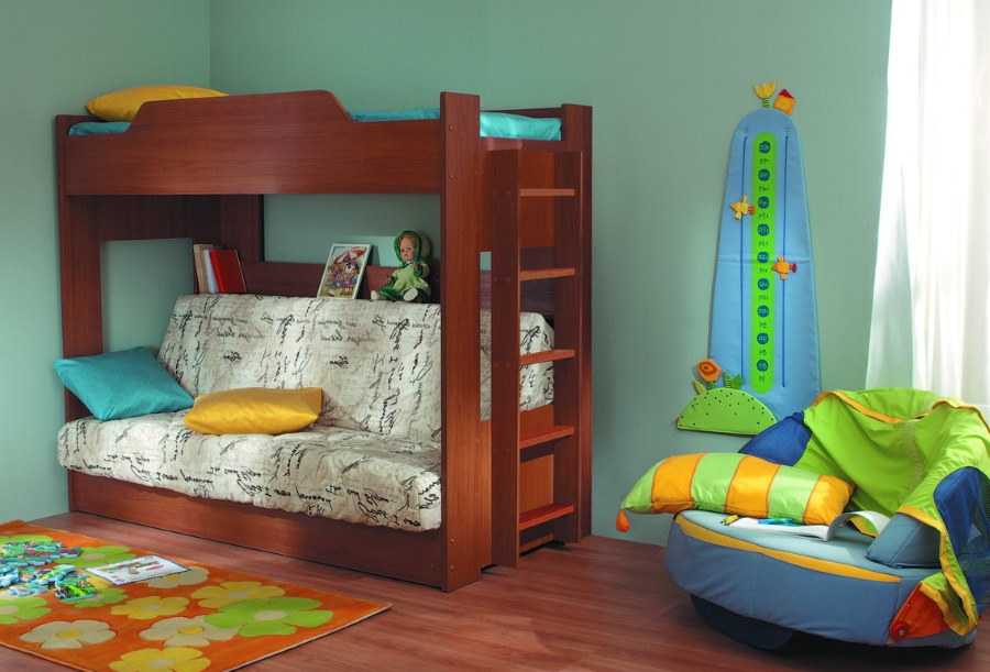 Если недостаточно места в комнате, то можно выбрать вариант с выдвижными кроватями-диванами. В дневное время модель легко собрать, освободив место для игр.