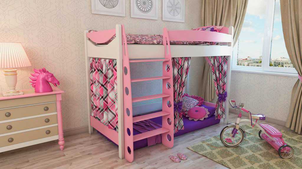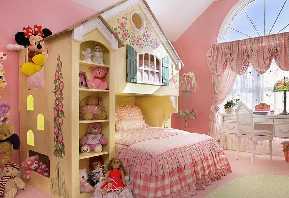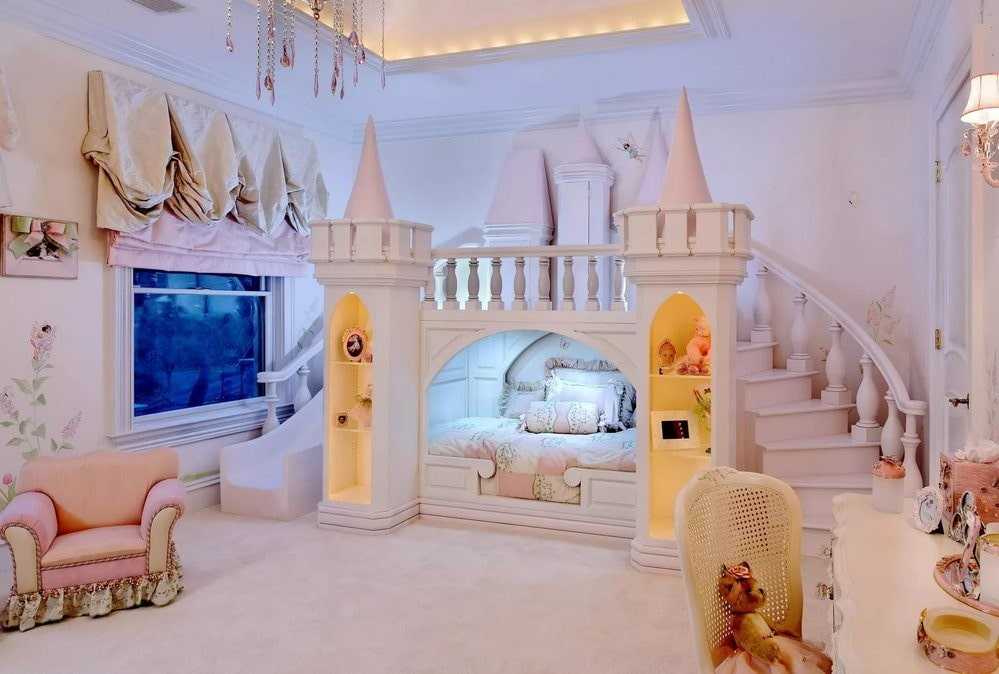 - Для спальной комнаты, в которой живут девочки, можно приобрести очаровательную модель, стилизованную под замок принцессы. Более гармонично будут смотреться изделия нежно-розовых или персиковых тонов.