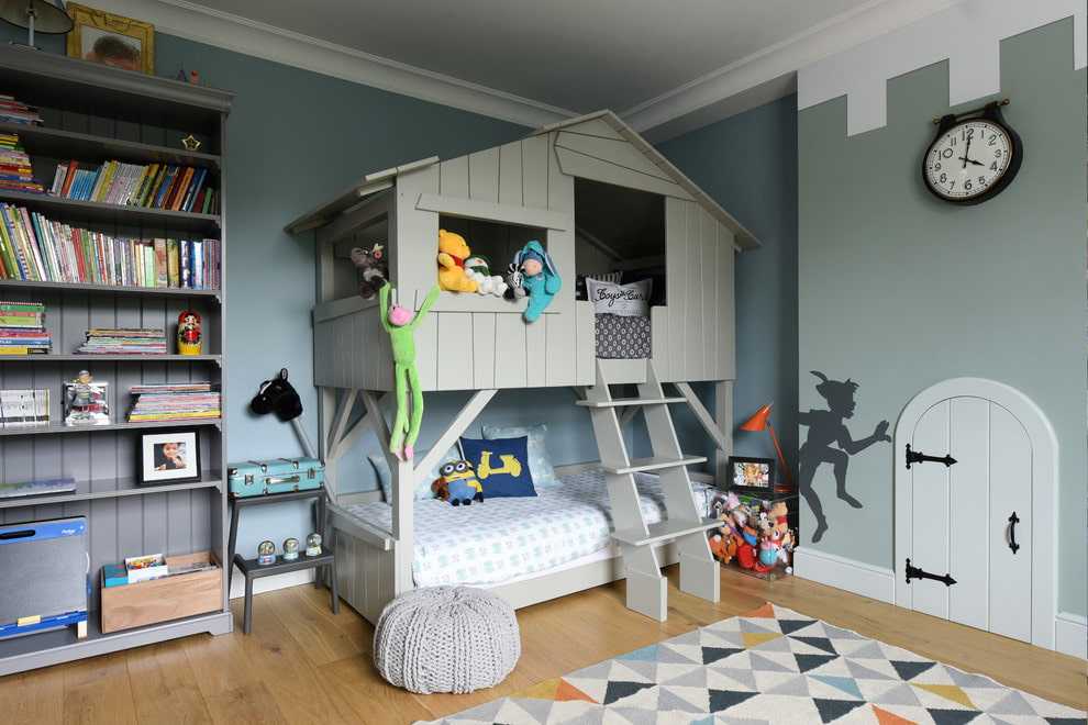 - Очень оригинально и привлекательно в интерьере детской комнаты будет смотреться двухуровневая кровать, стилизованная под домик на дереве.