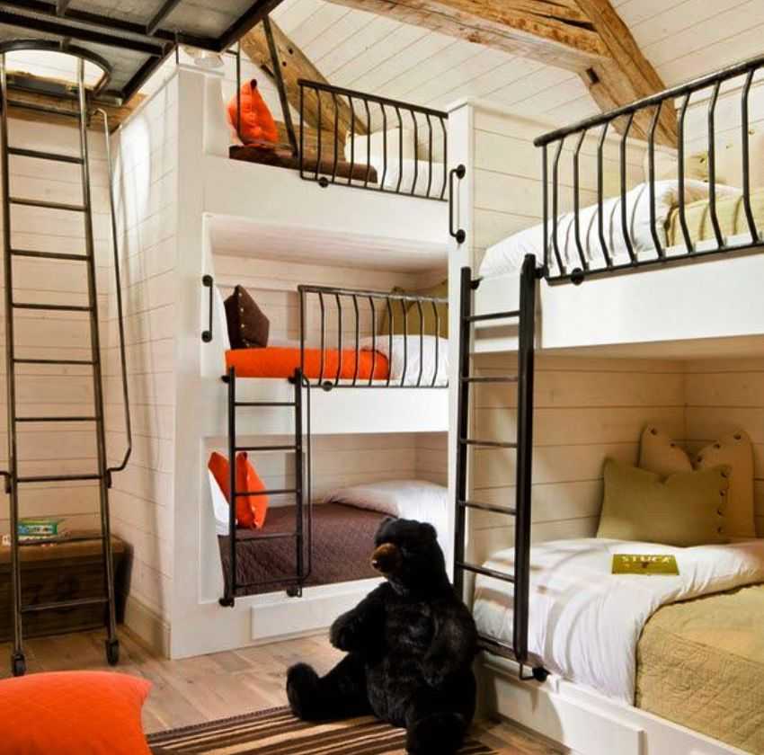 Модель для двух или трех детей. Если вы являетесь счастливыми родителями двух, трех или даже четырех малышей, вы можете оборудовать для них многоэтажный домик кровать, где на разных уровнях высоты будут располагаться спальные места для юных членов семьи. Отличным решением организации спального места служат также дополнительные выкатные ложа на нижнем ярусе.
