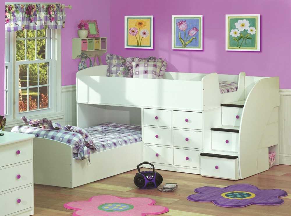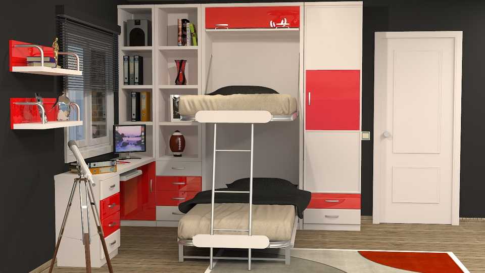Если комната скромного размера, где шкаф занимает большую часть площади, лучше будет смотреться кровать двухъярусная с ящиками, которые легко выдвигаются, имеют отсеки для игрушек, мелких предметов, белья. Наиболее вместителен угловой шкаф. В больших отделениях отводят место для верхнего гардероба, одежды, а множество полок и ящиков предназначены для размещения мелких предметов. Если спальный гарнитур имеет два шкафа, каждый из них служит местом хранения одежды одного ребенка. На дверцы шкафов лучше надеть специальные фиксаторы, которые помогут оставлять их в нужном положении, исключая травмы. На боковых стеллажах, стеклянных полках и нишах располагают книги, письменные принадлежности, фотографии, сувениры.