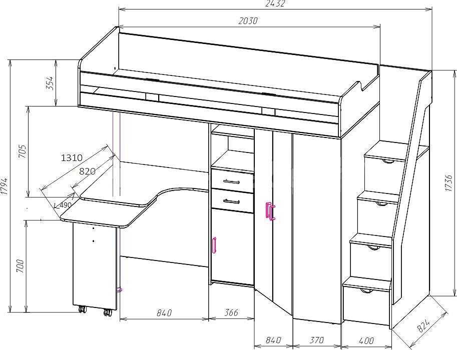 Стандартно прямой шкаф располагается снизу рядом со столом или сбоку от конструкции. Прямоугольная модель может выступать как встроенный элемент изделия и фиксироваться на первом ярусе. Шкаф может размещаться отдельно, как самостоятельный объект комплекта кровати-стенки. Угловой шкаф, являющийся частью конструкции, располагается на нижнем ярусе и выступает как опора для верхнего спального места. Отличие радиусных стеллажей со створками – изогнутые, гибкие формы.