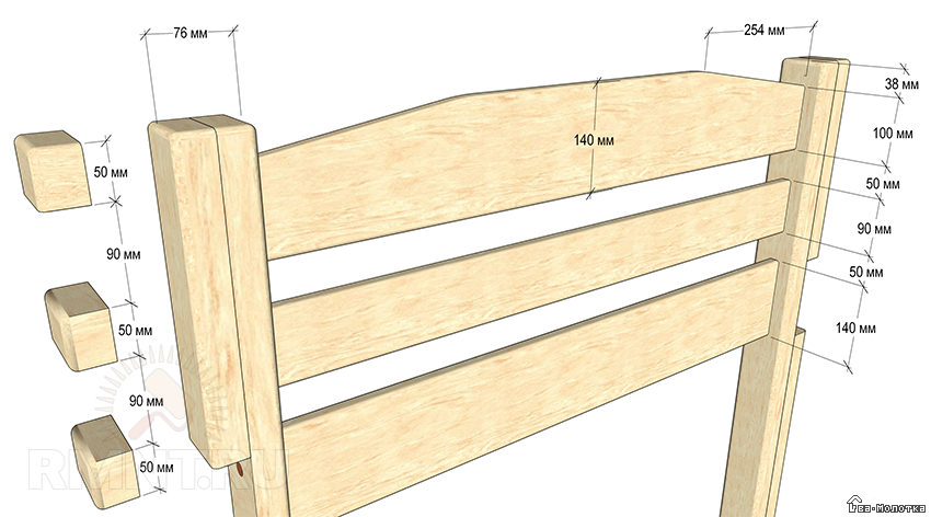 Для боковых стенок, делящихся на изголовье и спинку, потребуются по две отшлифованные доски (одна несколько уже второй) и по четыре боковые рейки. Крепление изголовья осуществляется следующим образом: