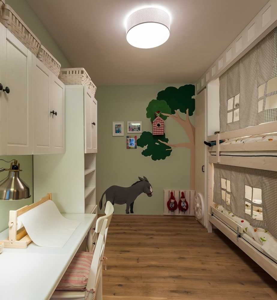 Здесь выбор пал на автономные спальные места, а не на двухъярусные, во многом потому что высота потолков не позволяет с комфортом разместить верхнюю кровать с достаточным объемом воздуха. На противоположной стене два небольших стола с набором полок, а также платяной шкаф. Обратите внимание на мебель, ее фасады максимально светлых оттенков, чтобы визуально помещение казалось как можно более просторным. Заметим, что добавляя некоторые детали, вы можете легко преобразить дизайн в комнату для подростка, убрав лишь самые «детские» элементы, такие как игрушки или декор навесных полок.