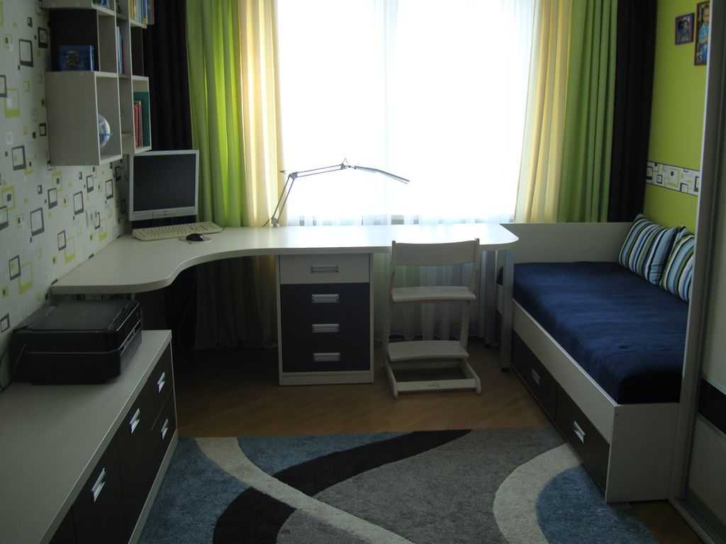 Обратите внимание на угловые модели мебели, она займет меньше места в комнате. Небольшую часть стены или площадь двери можно использовать под меловые обои, тогда меньше вероятность, что ваш ребенок разрисует стены.