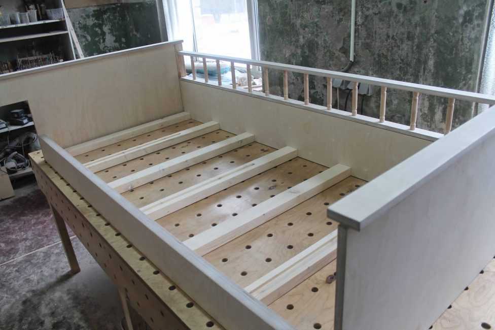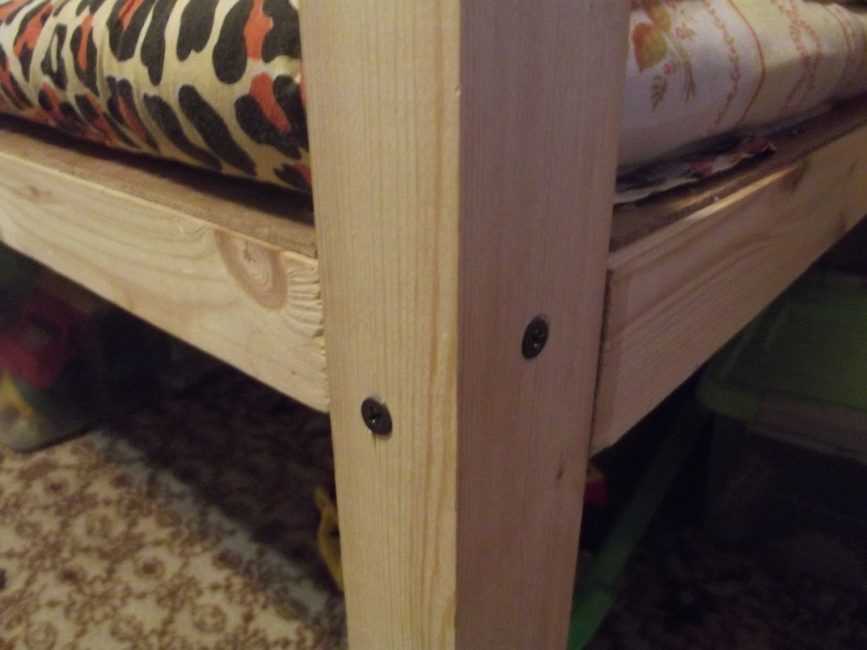 Основа конструкции — рама из бруса, к которой крепят все остальные детали: бортики, перила. Брусья должны быть выше уровня верхнего лежака на высоту спинки или бортиков. Чтобы обеспечить безопасность, высота должна быть не меньше 40 см от верхнего края матраса.