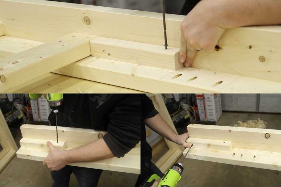 Вариант несложный. Для его реализации понадобился только шуруповерт, пила по дереву и крепежные элементы. Этот вариант сборки для тех, кто с плотницким делом незнаком и кому запилы и пазы делать сложно. Если сильно не нравится торчащий крепеж, закрыть его можно декоративными накладками: тонкие дощечки можно посадить на клей. Они скроют все недостатки сборки.